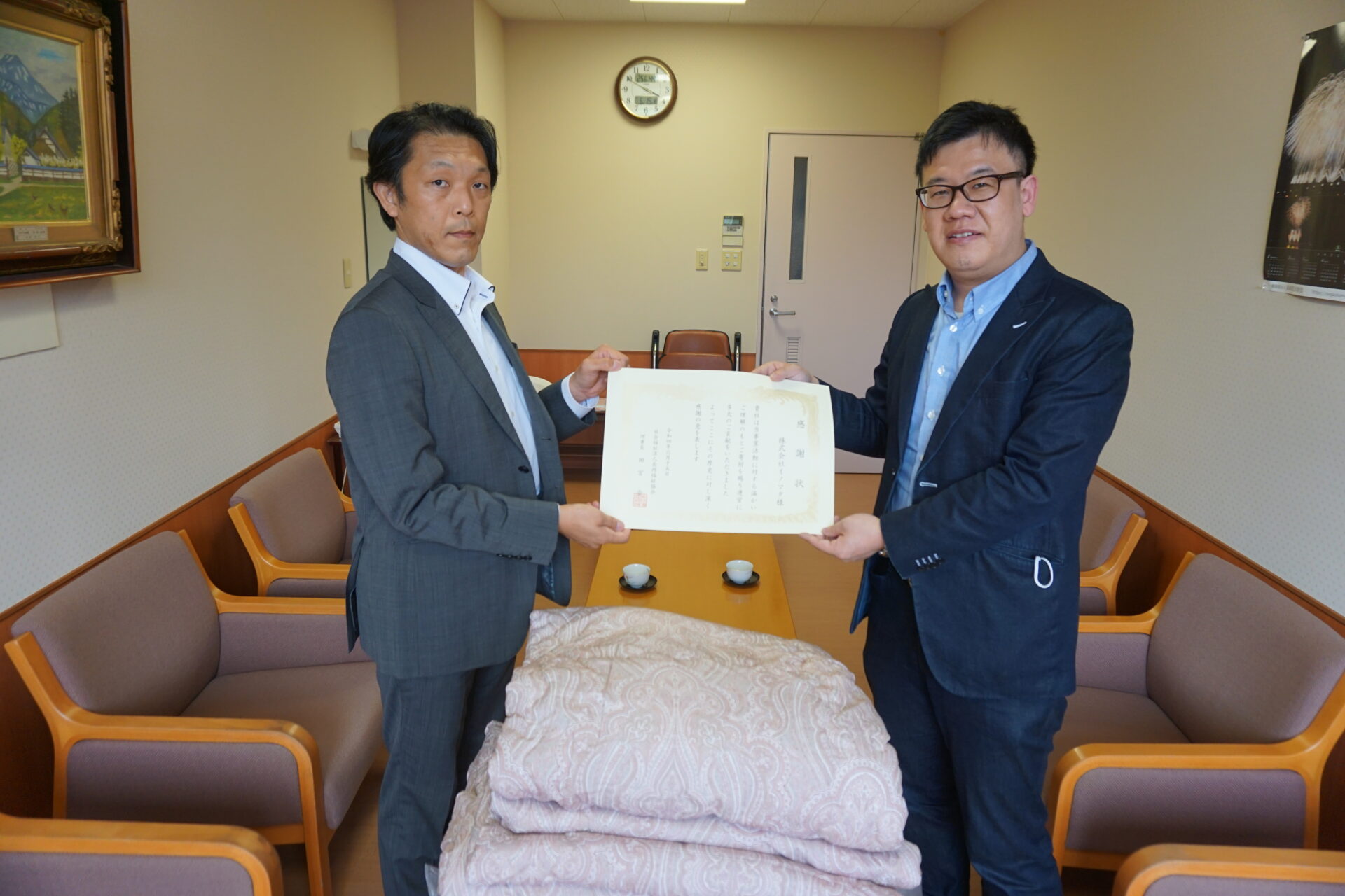 先日(6月15日)「株式会社イノマタ」様より、掛布団を90枚ご寄附いただきました。