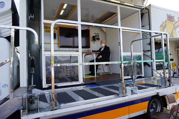 今回は体験型の訓練として、敷地内の駐車場に3種類(地震体験車、通報疑似体験、